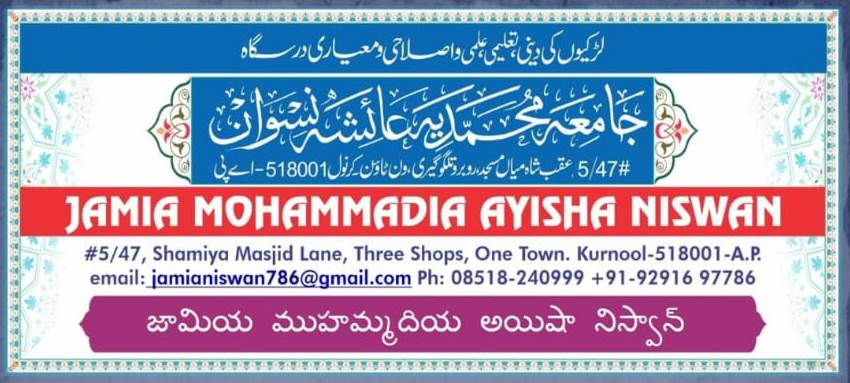 Jamia Mohammadia Ayisha Niswan is an ancient religious institution of religious education and training for women and girls in the city of Kurnool, which was founded by Hazrat Maulana Syed Shah Noorullah Qadri (may Allah have mercy on him) 26 years ago today.