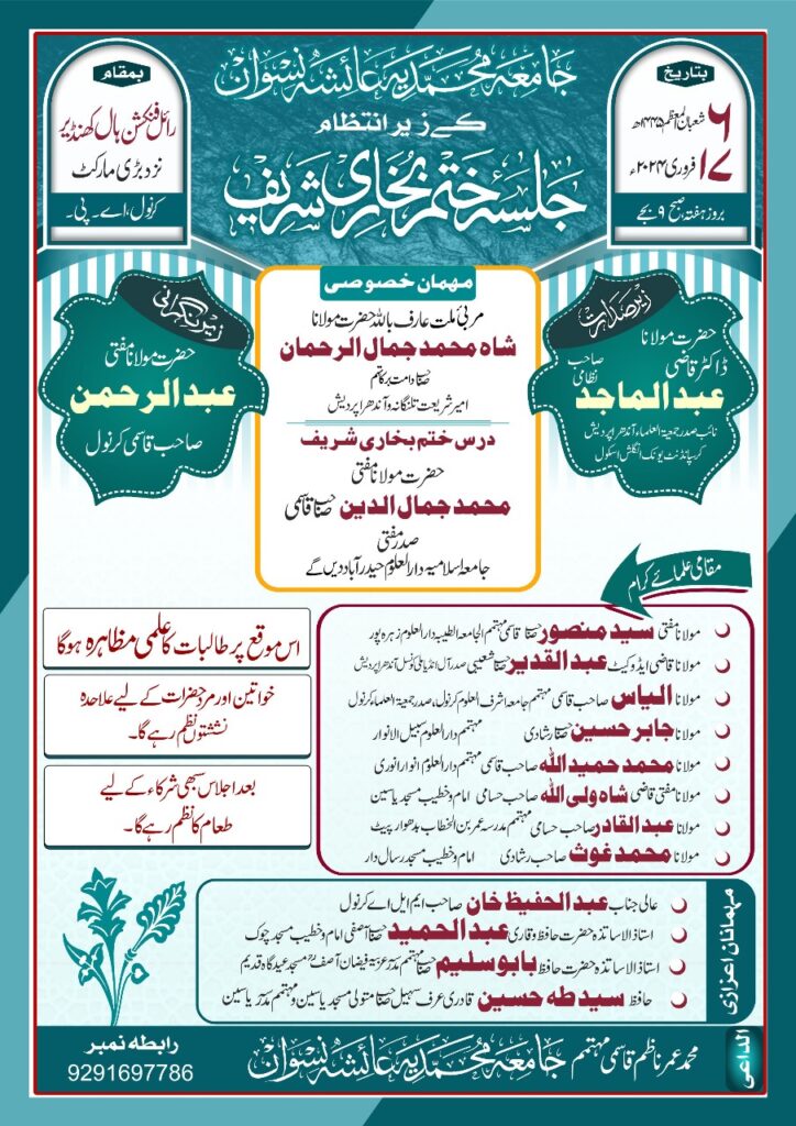 لڑکیوں کو حفظ کروانے کے خواہش مند والدین کے لیے خوش خبری جامعہ محمدیہ عائشہ نسواں کرنول میں شعبہ حفظ کا قیام لڑکیوں کے لیے شعبۂ عالمیت میں آندھرا ورائل سیما کے قدیم ادارہ جامعہ محمدیہ عائشہ نسواں کرنول میں بحمداللہ ہچھلے 26سال سے شعبہ عالمیت وفضیلت مع عصری علوم قائم ہے ۔ ادارہ ھذا